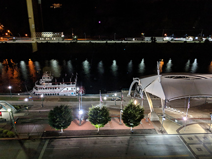 Our room had a great view of the Kanawha River, and there was a riverboat right outside our window. Even though it was late I stayed up even longer and took photos from the hotel window. The lights from the nearby buildings reflecting off the water were magical. This was by far the best part of the room, although having a common area was a super close second.