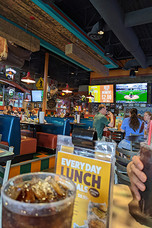 We crossed into North Dakota around 5:30PM and headed directly to our hotel which was a La Quinta Inn & Suites that was near the medical center in Fargo. About an hour later we pulled into the parking lot of the hotel. At this time of day on a Thursday evening, there was lots of open parking spots. We parked a few rows back from the entrance, rolled our suitcases to the check in desk and went upstairs to our room. By 7:00PM we were sitting at a table at Sickies Garage Burgers & Brews.