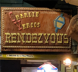 It wasn’t exactly late when we were settled into our room, but it could be considered late for dinner. It was after 8:00 PM by the time we were ready to head back out. The restaurant, Charlie Vergo’s Rendezvous, was nearby, we needed to cross the street and walk about 2 blocks. Along our walk there were signs for the restaurant and folded up rope chains that you’d normally see at places that often have long lines, like a movie theatre or amusement park ride. Seeing those gave us an inkling of just how busy Rendezvous generally gets.